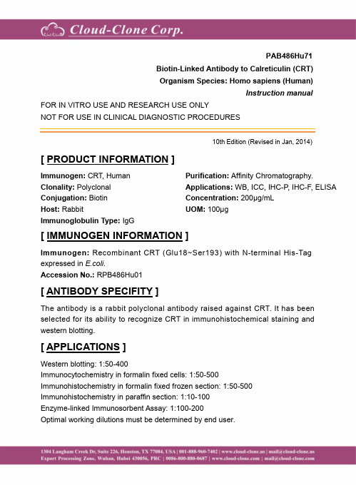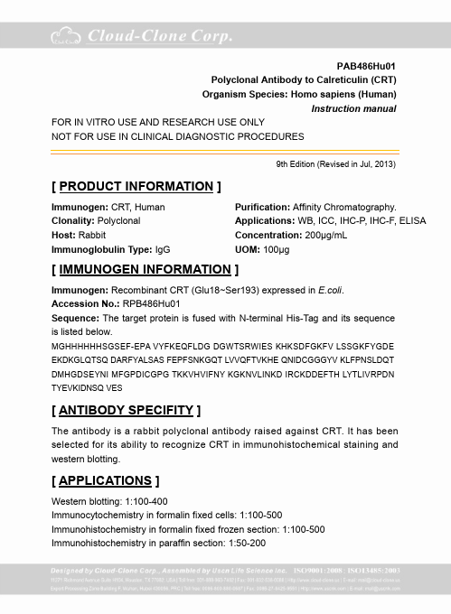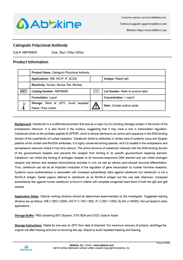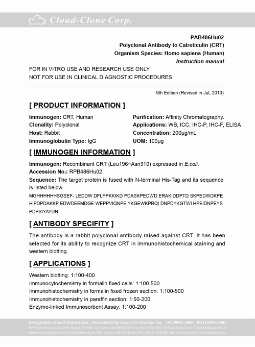 Antigen:CalreticulinSynonyms: CRP55; Calregulin; Endoplasmic reticulum resident protein 60; HACBP; grp60; CALR_HUMAN; P27797; Q6IAT4; Q9UDG2