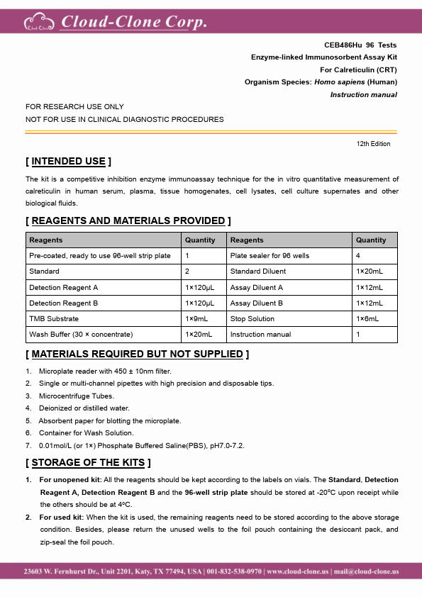 Aliases:Autoantigen RO; CALR; CALR protein; CALR_HUMAN; Calregulin; Calreticulin; cC1qR; CRP55; CRT; CRTC; Endoplasmic reticulum resident protein 60; Epididymis secretory sperm binding protein Li 99n; ERp60; FLJ26680; grp60; HACBP; HEL S 99n; RO; Sicca syndrome antigen A (autoantigen Ro; calreticulin); Sicca syndrome antigen A; SSA