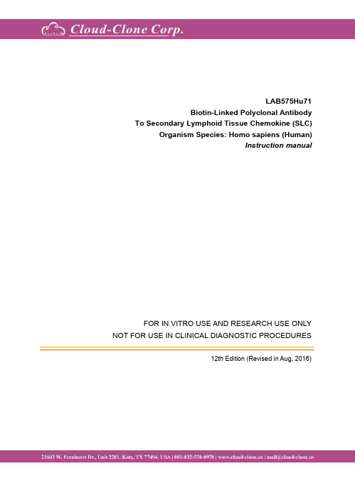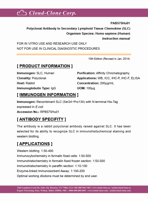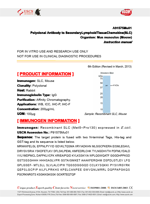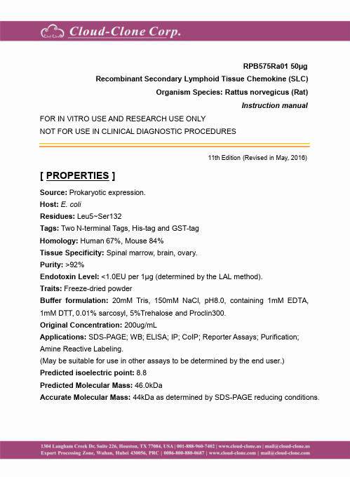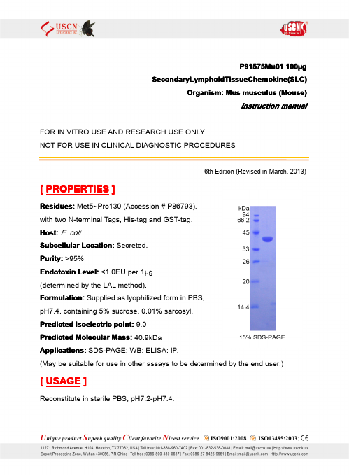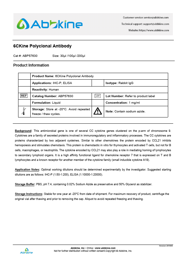 Antigen:C-C motif chemokine 21Synonyms: 6Ckine; Beta-chemokine exodus-2; Secondary lymphoid-tissue chemokine; Small-inducible cytokine A21; CCL21_HUMAN; O00585; Q6ICR7