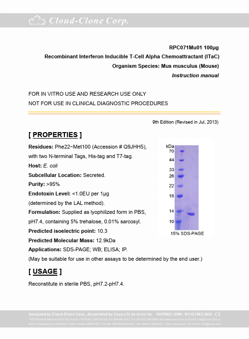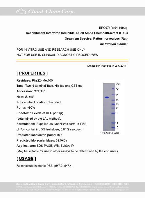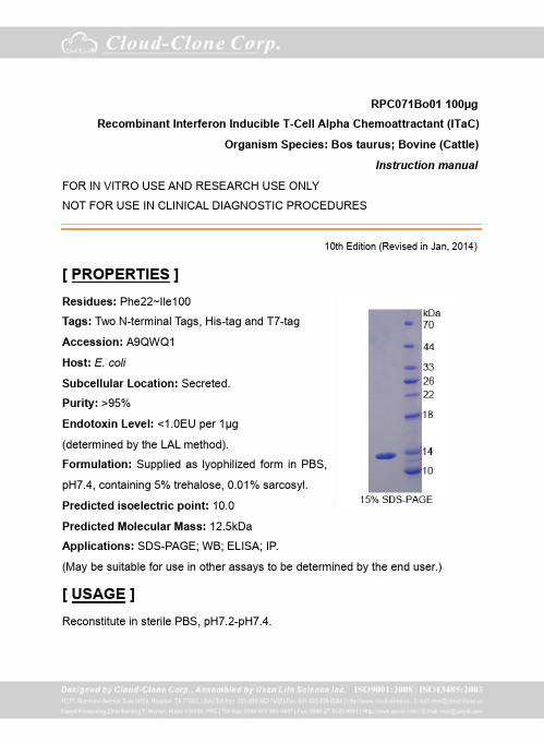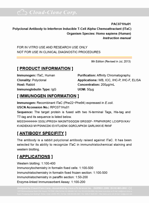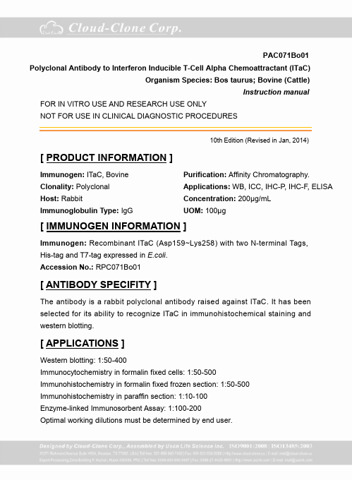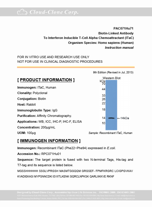 Antigen:C-X-C motif chemokine 11Synonyms: Beta-R1; H174; Interferon gamma-inducible protein 9; Interferon-inducible T-cell alpha chemoattractant; Small-inducible cytokine B11; CXL11_HUMAN; O14625; Q53YA3; Q92840