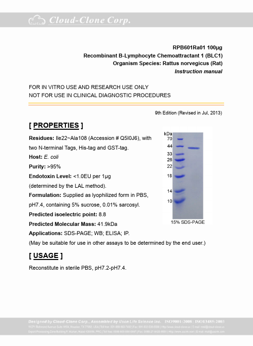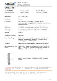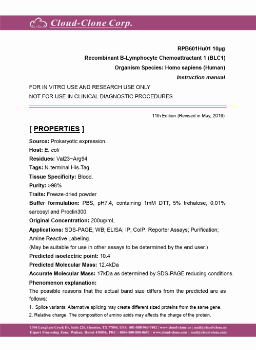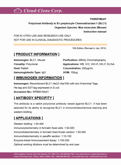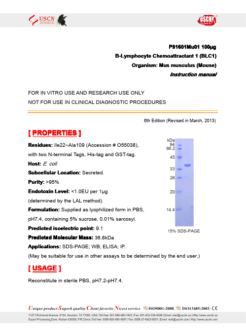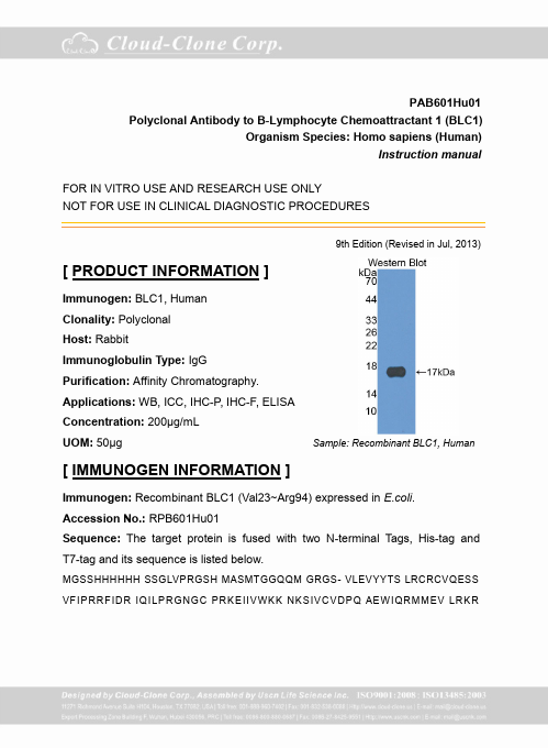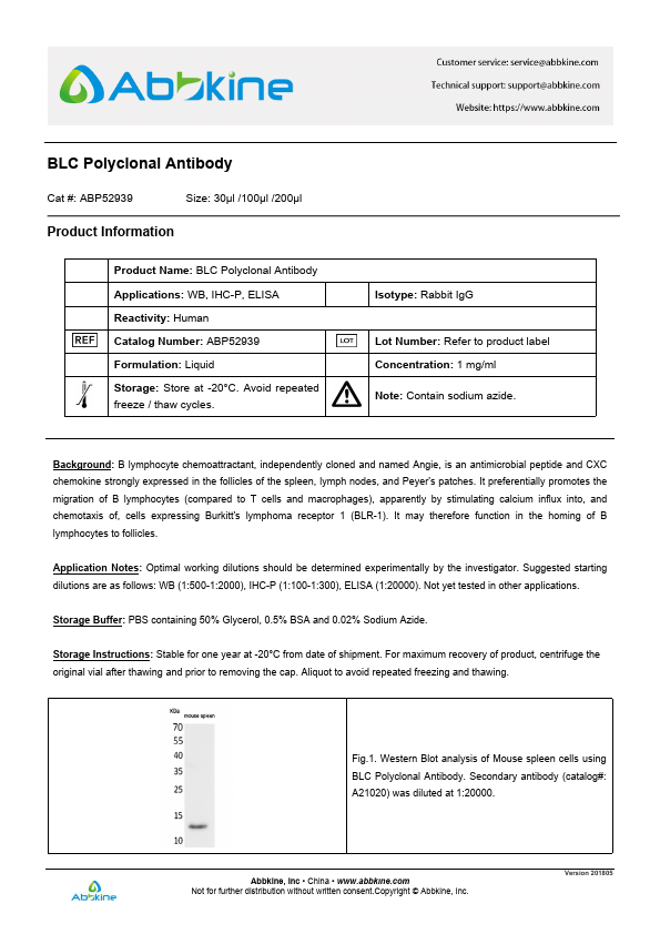 Antigen:C-X-C motif chemokine 13Synonyms: Angie; B cell-attracting chemokine 1; B lymphocyte chemoattractant; CXC chemokine BLC; Small-inducible cytokine B13; CXL13_HUMAN; O43927