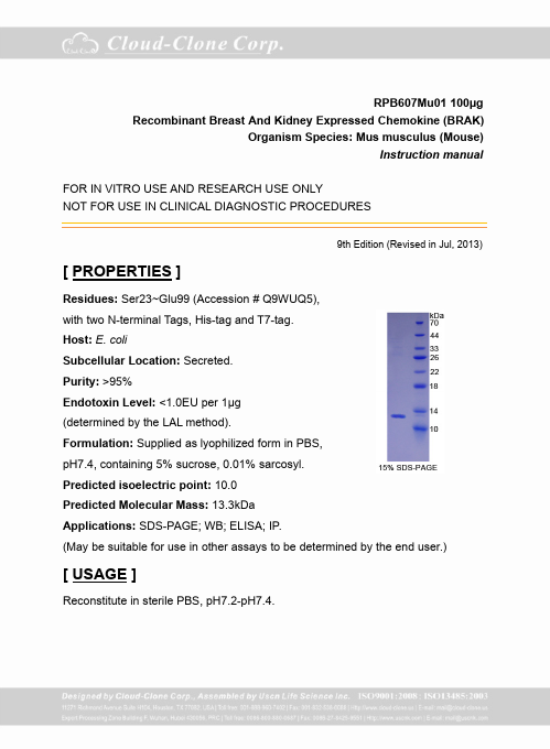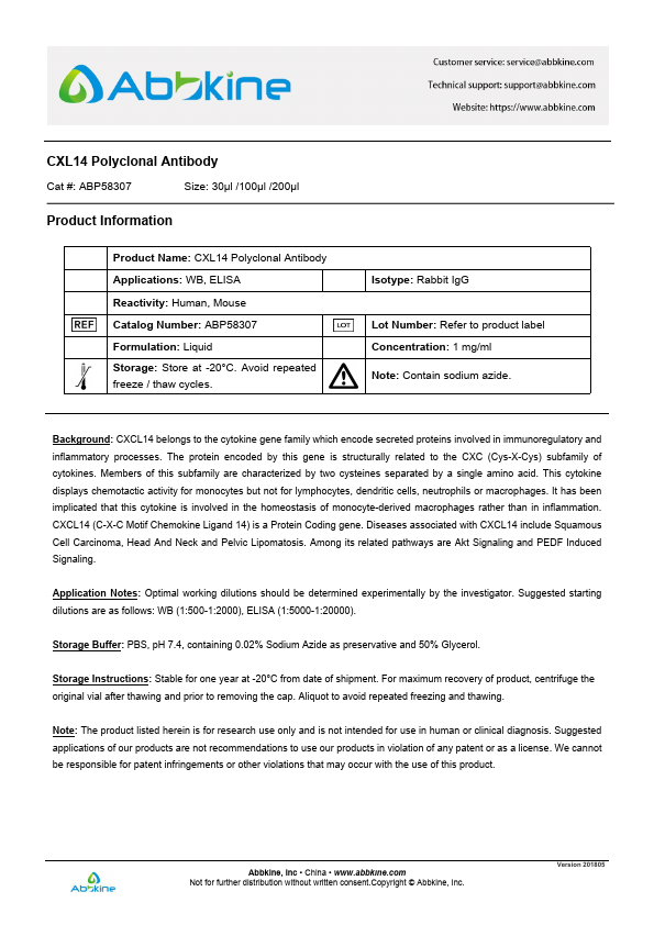 Aliases:1110031L23Rik; 1200006I23Rik; AI414372; BMAC; bolekine; BRAK; Breast and kidney; C-X-C motif chemokine 14; C-X-C motif chemokine ligand 14; Chaemokine, CXC motif, ligand 14; Chemokine (C-X-C motif) ligand 14; Chemokine BRAK; CXC chemokine in breast and kidney; CXCL14; CXL14_HUMAN; JSC; Kec; Kidney-expressed chemokine CXC; KS1; MGC10687; MGC124510; MGC90667; MIP 2 gamma; MIP-2G; MIP2G; MIP2gamma; NJAC; PRO273; PSEC0212; Scyb14; Small Inducible Cytokine B14; Small inducible cytokine subfamily B (Cys-X-Cys) member 14 (BRAK); Small Inducible Cytokine subfamily B, member 14; Small-inducible cytokine B14; Tumor suppressing chemokine; UNQ240