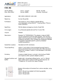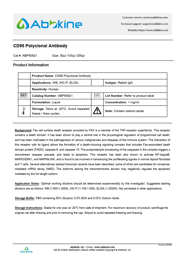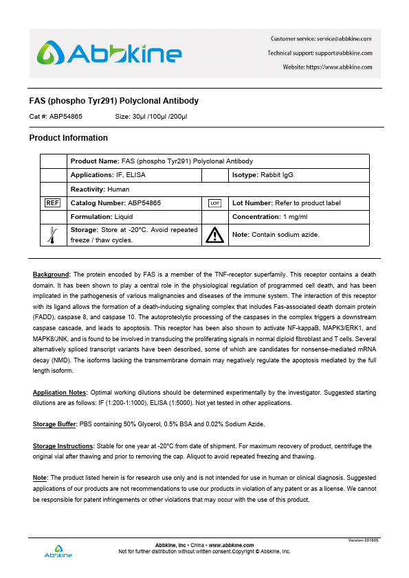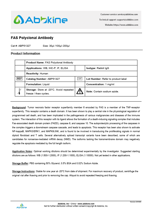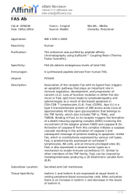 Fas is a glycoprotein with a mass estimated at 43 to 48 kDa . Fas is a member of the Tumor Necrosis Factor Receptor Superfamily (TNFRSF), and it shares a cytoplasmic motif with TNF RI, referred to as the death domain, that binds cytoplasm signaling molecules to trigger the cytoplasmic apoptotic signal . Fas is expressed to a large extent on activated T and B lymphocytes, and on malignant lymphoid cells. To a lesser extent, Fas is expressed on cells from liver, heart, kidney, ovaries, and on many other malignant cells. Yan et al. (2005) noted that the TNFRSF6 gene contains 9 exons. They identified an antisense transcript SAF within the 12.1-kb intron 1 that is transcribed in the opposite direction as the TNFRSF6 gene.