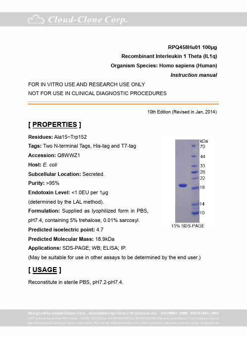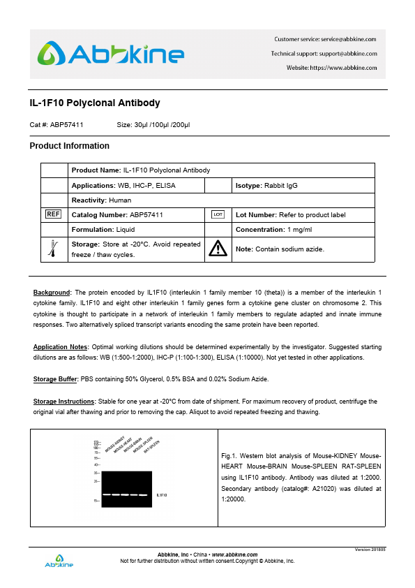 Antigen:Interleukin-1 family member 10Synonyms: Family of interleukin 1-theta; Interleukin-1 HY2; Interleukin-1 theta; Interleukin-38; IL1FA_HUMAN; Q53SR9; Q56AT8; Q7RTZ5; Q8WWZ1; Q969H5; Q9BYX1