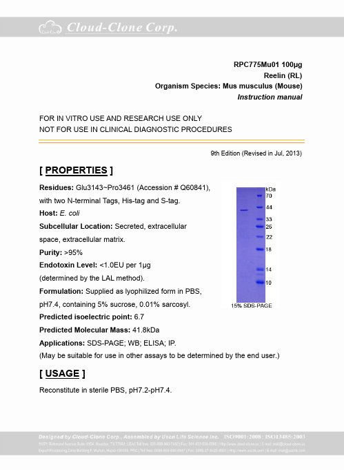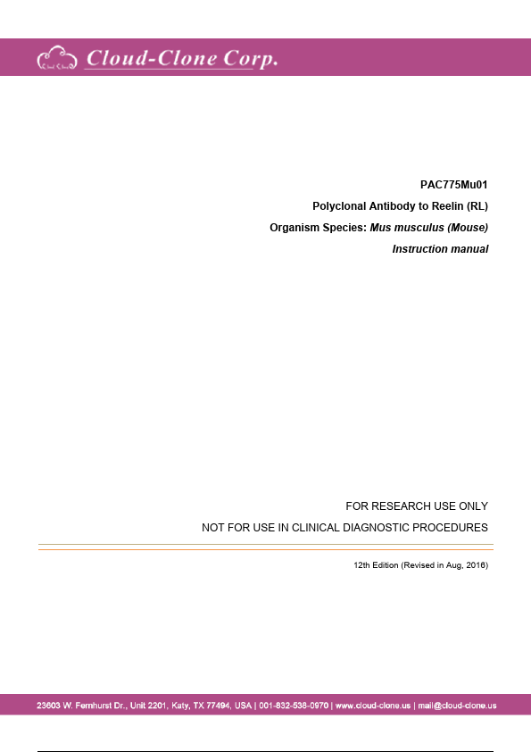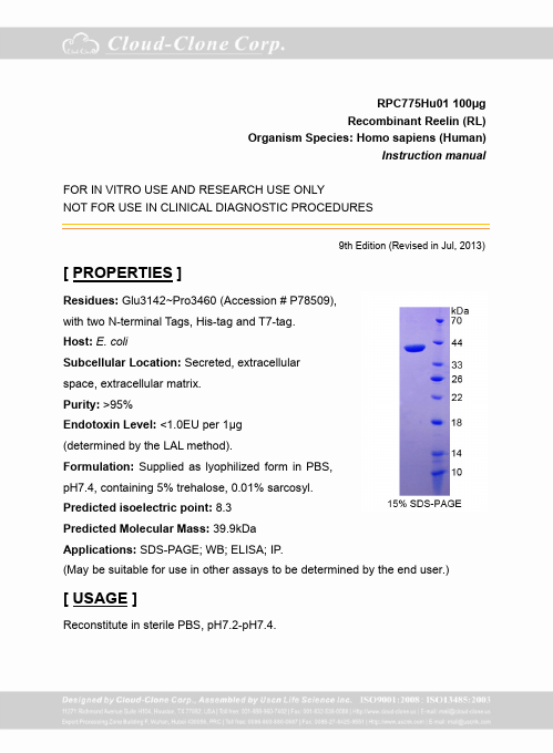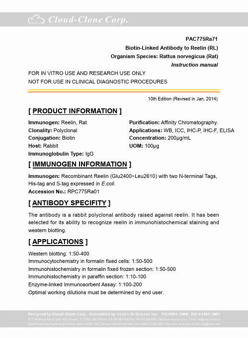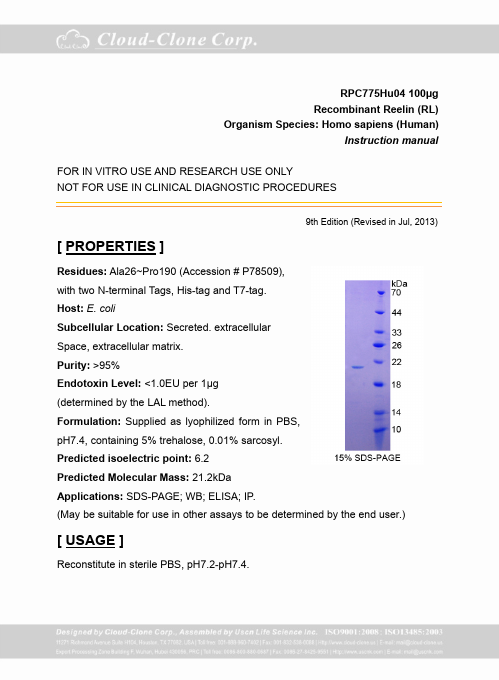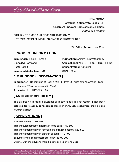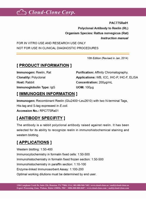 Antigen:ReelinSynonyms: RELN_HUMAN; A4D0P9; A4D0Q0; P78509; Q86UJ0; Q86UJ8; Q8NDV0; Q9UDQ2