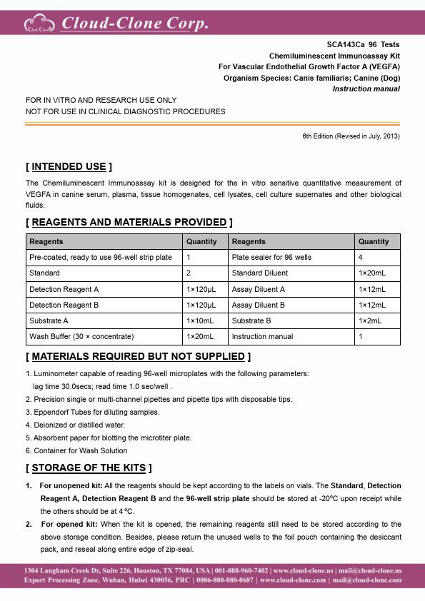 Synonyms: The microplate provided in this kit has been pre-coated with an antibody specific to Vascular Endothelial Growth Factor A (VEGFA). Standards or samples are then added to the appropriate microplate wells with a biotin-conjugated antibody specific to Vascular Endothelial Growth Factor A (VEGFA). Next, Avidin conjugated to Horseradish Peroxidase (HRP) is added to each microplate well and incubated. Then the mixture of substrate A and B is added to generate glow light emission kinetics. Upon plate development, the intensity of the emitted light is proportional to the Vascular Endothelial Growth Factor A (VEGFA) level in the sample or standard.